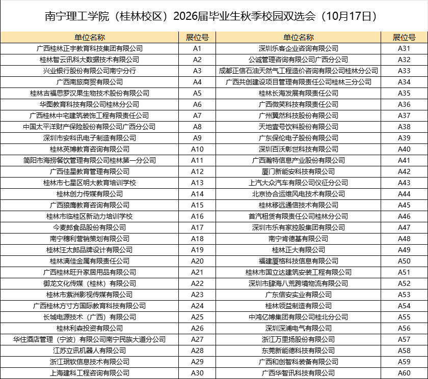 感谢您对南宁理工学院(桂林校区)2026届毕业生秋季校园双选会的关注!本次双选会汇聚60余家优质企业,涵盖房地产、信息技术、制造、建筑、教育等多个热门行业,提供岗位2000+,助力每一位学子斩获心仪Offer!