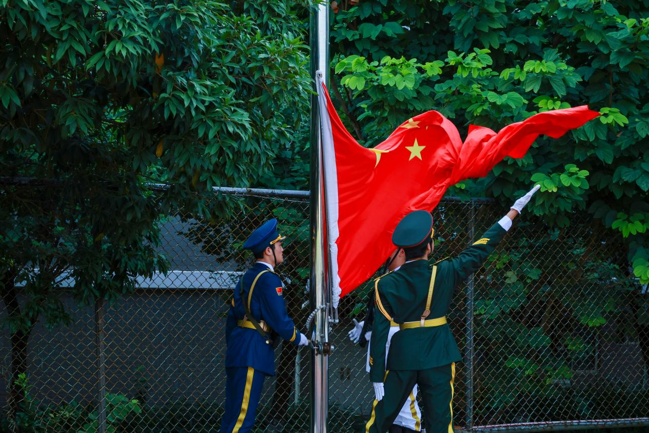 国旗护卫队身着整齐制服,迈着铿锵有力的步伐,庄严护送五星红旗正步走向旗杆。激昂雄壮的《义勇军进行曲》奏响,鲜艳的五星红旗在全体师生的注目礼中冉冉升起。现场师生神情肃穆,齐声高唱国歌,表达对祖国的深深热爱和崇高敬意。