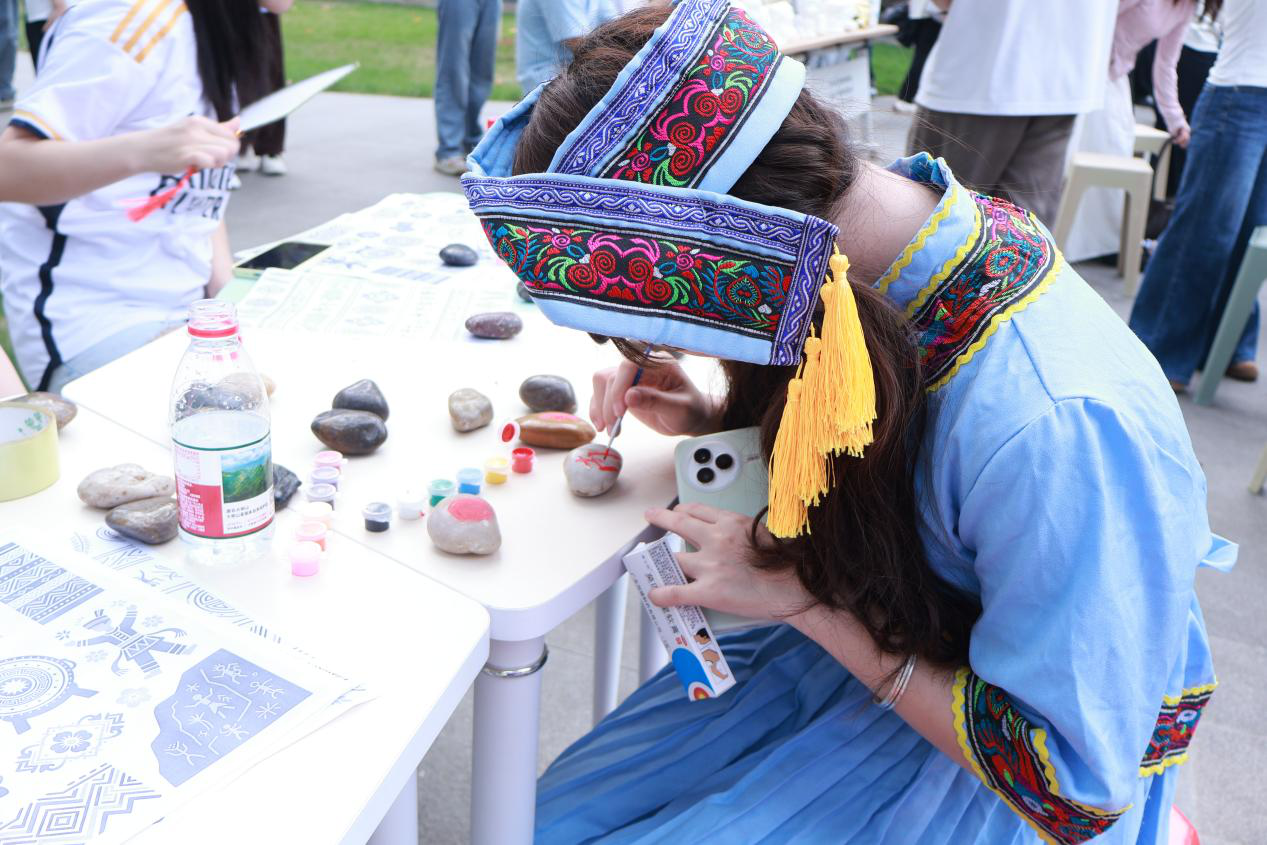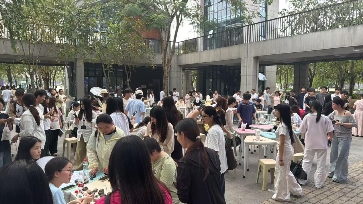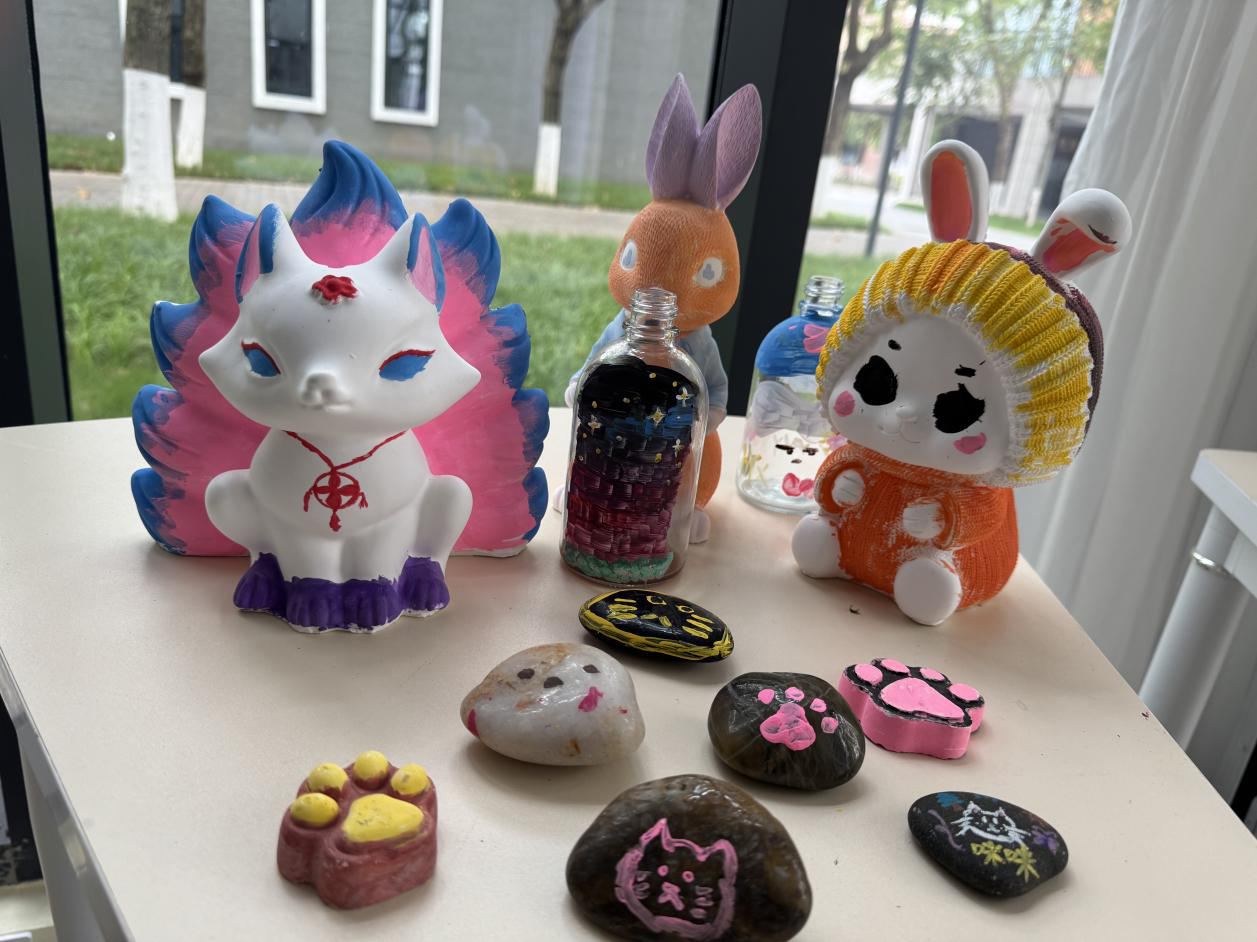 活动现场设有“石说心语”“春绪寄瓶”“钻缀春意”“膏塑心颜”四大创作区及“萌宠春日绘”互动区,各区域均融入壮乡元素与春日意象。在“石说心语”区,参与者以石头为载体,绘就爪印、萌宠等形象,将心绪凝于石间;“春绪寄瓶”环节,大家在玻璃瓶上创作壮锦、星空等图案,搭配情绪卡片,让色彩与民俗共筑疗愈氛围。“钻缀春意”与“膏塑心颜”则通过点钻、石膏彩绘,让参与者在专注创作中舒缓压力,铜鼓、绣球等民俗符号与萌宠造型相映成趣,现场交流热烈、氛围轻松。“萌宠春日绘”亲子互动区更是亮点十足,师生携萌宠打卡合影、制作民俗手作,并通过简单口令互动增进情感联结,完成互动者还收获了宠物粮食奖励。活动将萌宠陪伴与壮乡文化巧妙结合,贴近青年喜好,以温情形式为心灵赋能,让疗愈更具温度与活力。