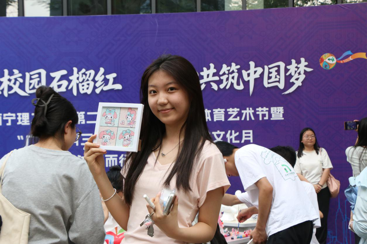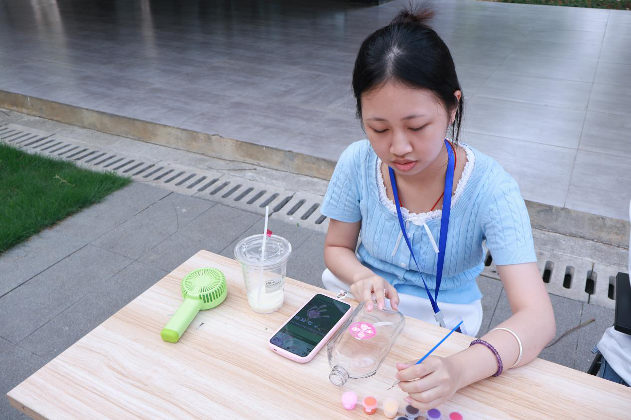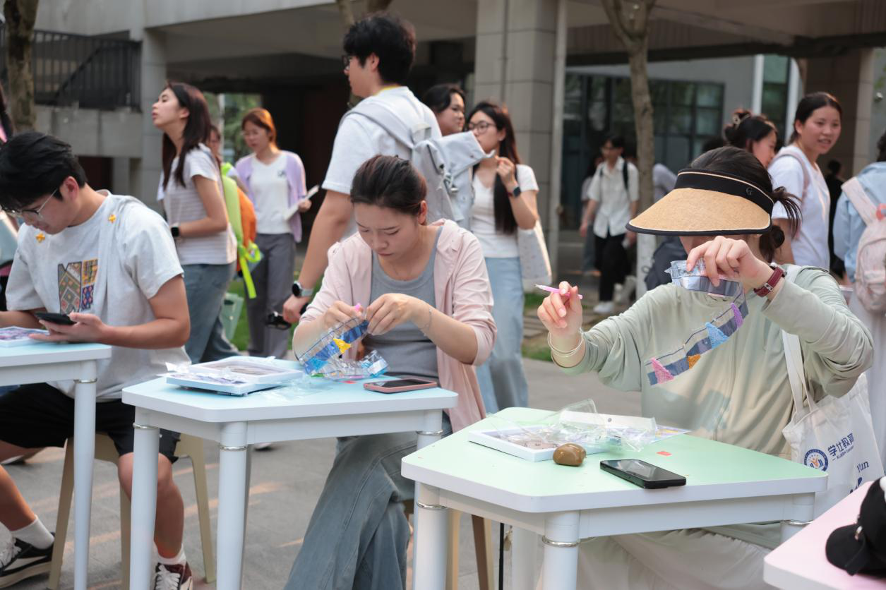 活动现场设有“石说心语”“春绪寄瓶”“钻缀春意”“膏塑心颜”四大创作区及“萌宠春日绘”互动区,各区域均融入壮乡元素与春日意象。在“石说心语”区,参与者以石头为载体,绘就爪印、萌宠等形象,将心绪凝于石间;“春绪寄瓶”环节,大家在玻璃瓶上创作壮锦、星空等图案,搭配情绪卡片,让色彩与民俗共筑疗愈氛围。“钻缀春意”与“膏塑心颜”则通过点钻、石膏彩绘,让参与者在专注创作中舒缓压力,铜鼓、绣球等民俗符号与萌宠造型相映成趣,现场交流热烈、氛围轻松。“萌宠春日绘”亲子互动区更是亮点十足,师生携萌宠打卡合影、制作民俗手作,并通过简单口令互动增进情感联结,完成互动者还收获了宠物粮食奖励。活动将萌宠陪伴与壮乡文化巧妙结合,贴近青年喜好,以温情形式为心灵赋能,让疗愈更具温度与活力。